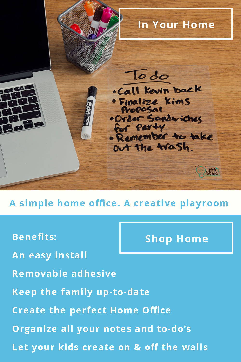 Think Board is a high quality dry erase film that turns any smooth surface into a premium whiteboard in minutes.